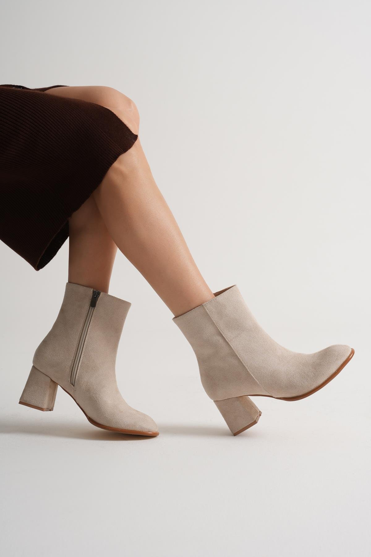 Neolit Taban Süet Görünümlü Fermuarlı Kadın Bej Kalın Topuklu Bot TBGZGN508 (TBGZGN508)