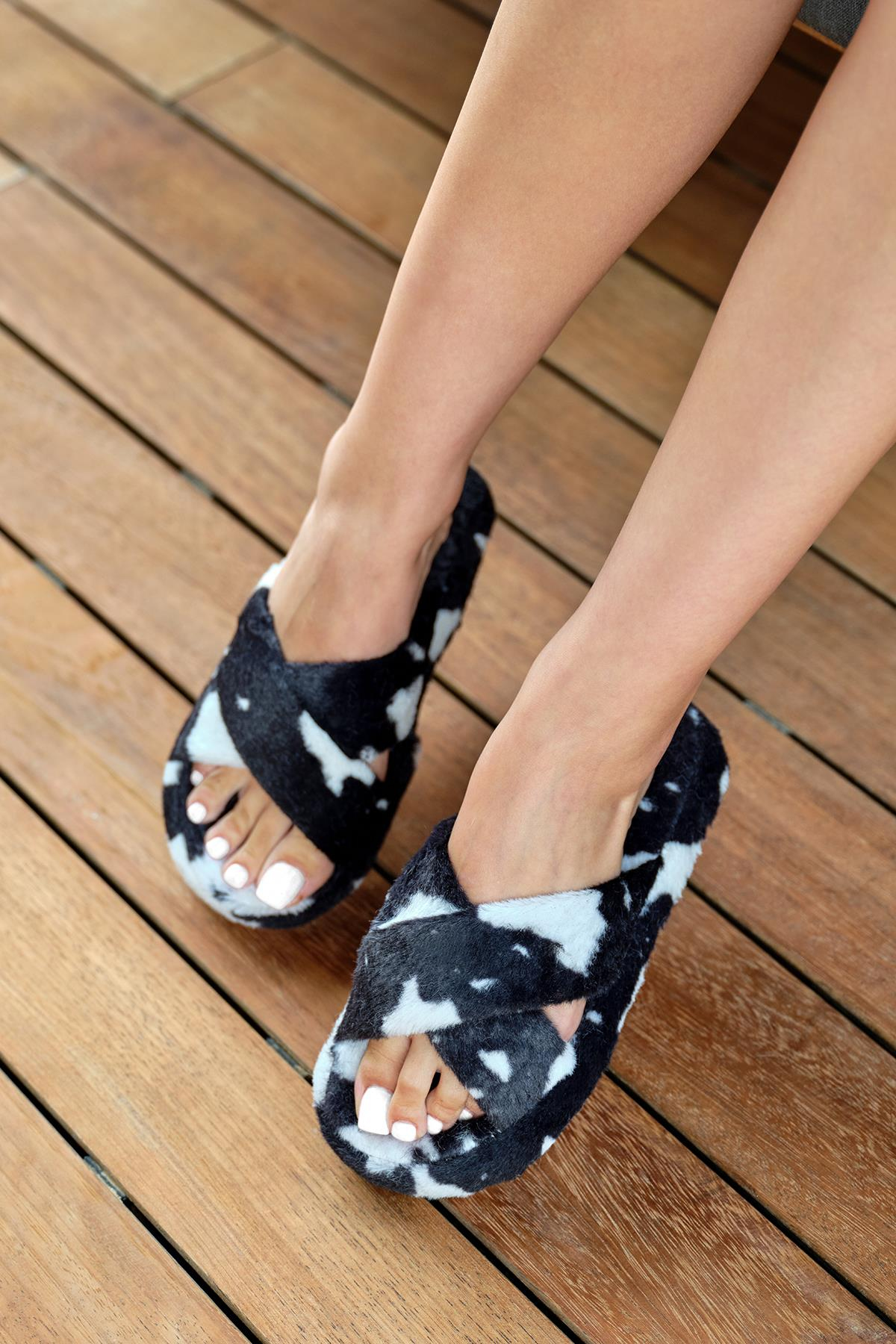 Desenli peluş dokusu ile şık ve sıcak bir görünüm sunar Çapraz bant tasarımı modern bir stil kazandırır Yumuşak yapısıyla ayağı sarar ve gün boyu konfor sağlar Kaymaz tabanı sayesinde ev içinde güvenli kullanım imkanı verir Hafif ve rahat yapısıyla adımlarınızı kolaylaştırır