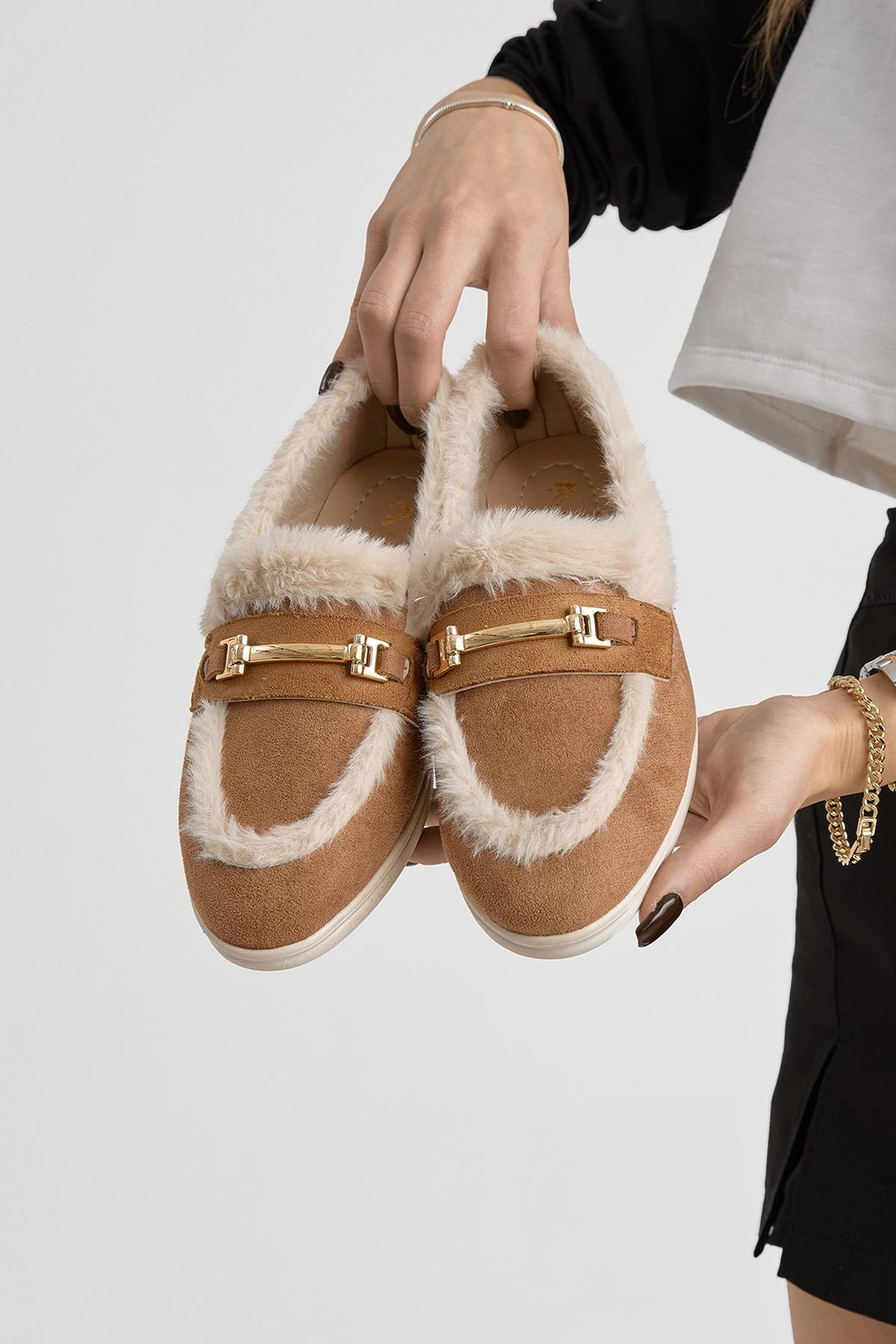 Termo Taban Kürk Detaylı Süet Görünümlü Tokalı Kadın Taba Günlük Loafer Ayakkabı TBMHH010 (TBMHH010)