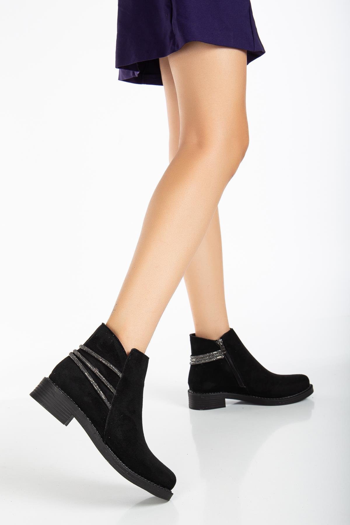 Termo Taban Taş Halatlı Fermuarlı Kısa Topuklu Kadın Siyah Süet Bot TBACR3508 (TBACR3508)