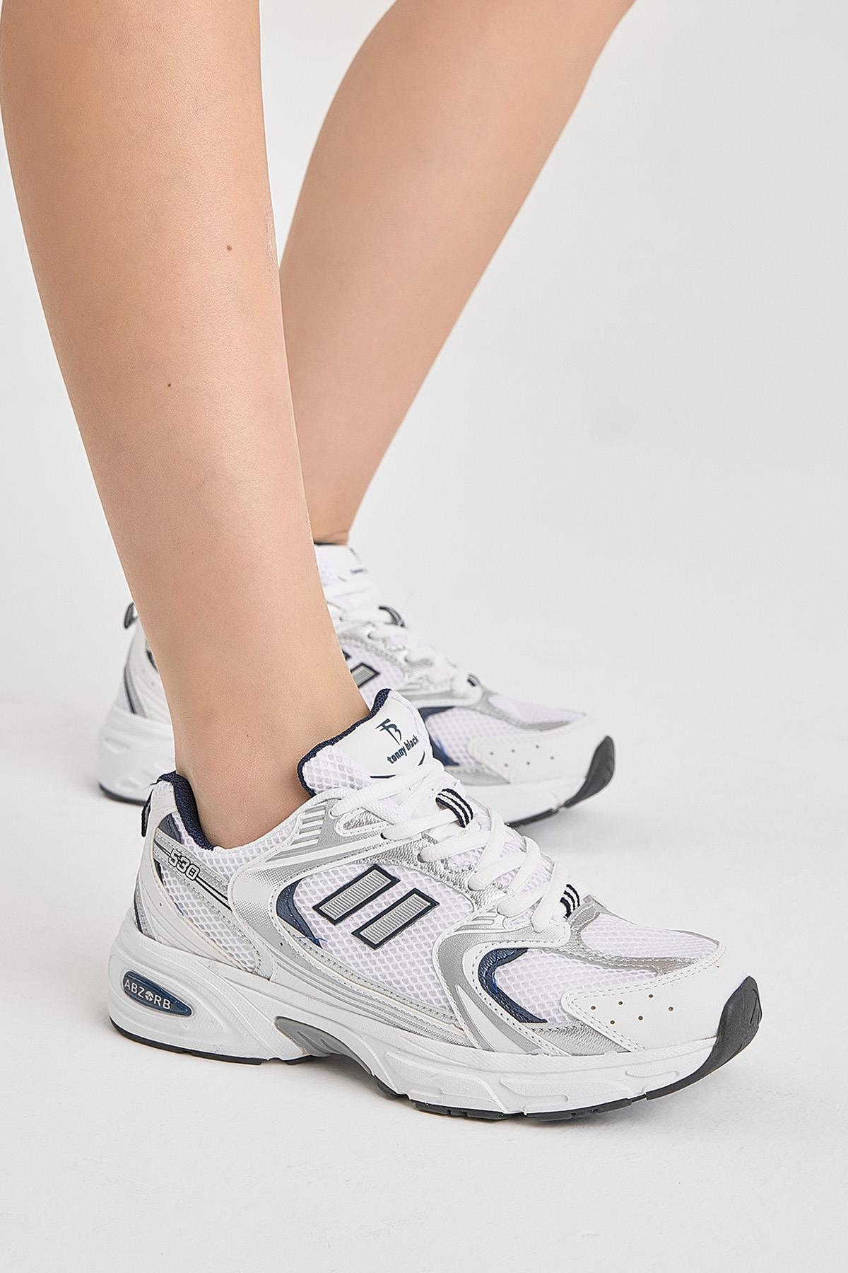 Yüksek Faylon Taban Fileli Desenli Kadın Beyaz Lacivert Spor Ayakkabı TBCM530 (TBCM530)